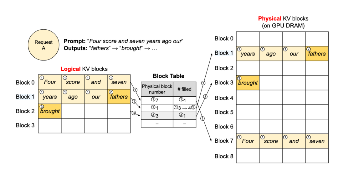 vLLM提出了一种类似于操作系统分页的方式来存储 KV 缓存。 vLLM 首先分配尽可能大的内存空间,并将其平均划分为多个物理块。 当请求到来时,vLLM 以不连续的方式动态地将生成的 KV 缓存映射到预分配的物理块中。 通过这种方式,vLLM 显著减少了存储碎片,并在 LLM 服务中实现了更高的吞吐量。