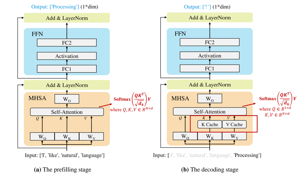 如上图所示,(a) 为预填充阶段;(b)为解码阶段。预填充阶段: 大语言模型计算并存储初始输入 token 的 KV 缓存,并生成第一个输出 token。解码阶段:LLM 使用 KV 缓存逐个生成输出 token,然后使用新生成的 token 的键 (K) 和值 (V) 对来更新 KV 缓存。