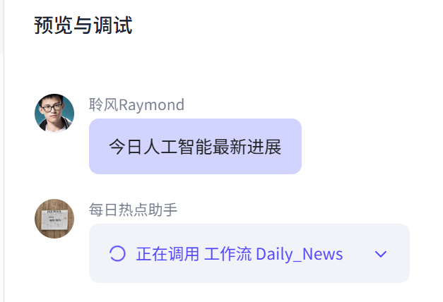 当你在“预览与调试”栏里,做测试时,可以看到它会自动调用刚刚设置好的工作流