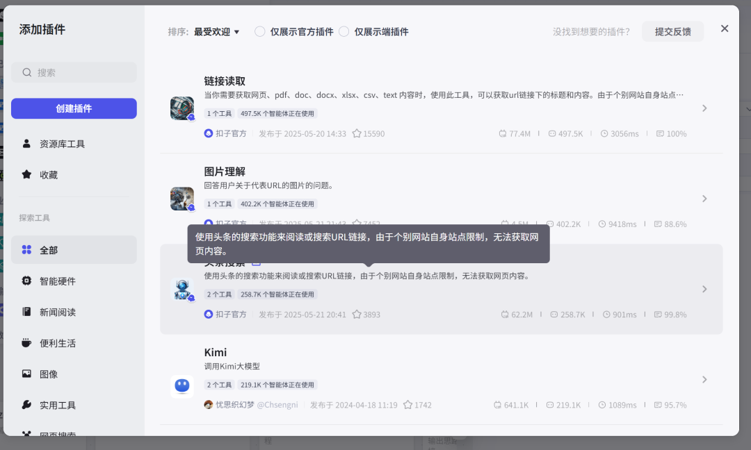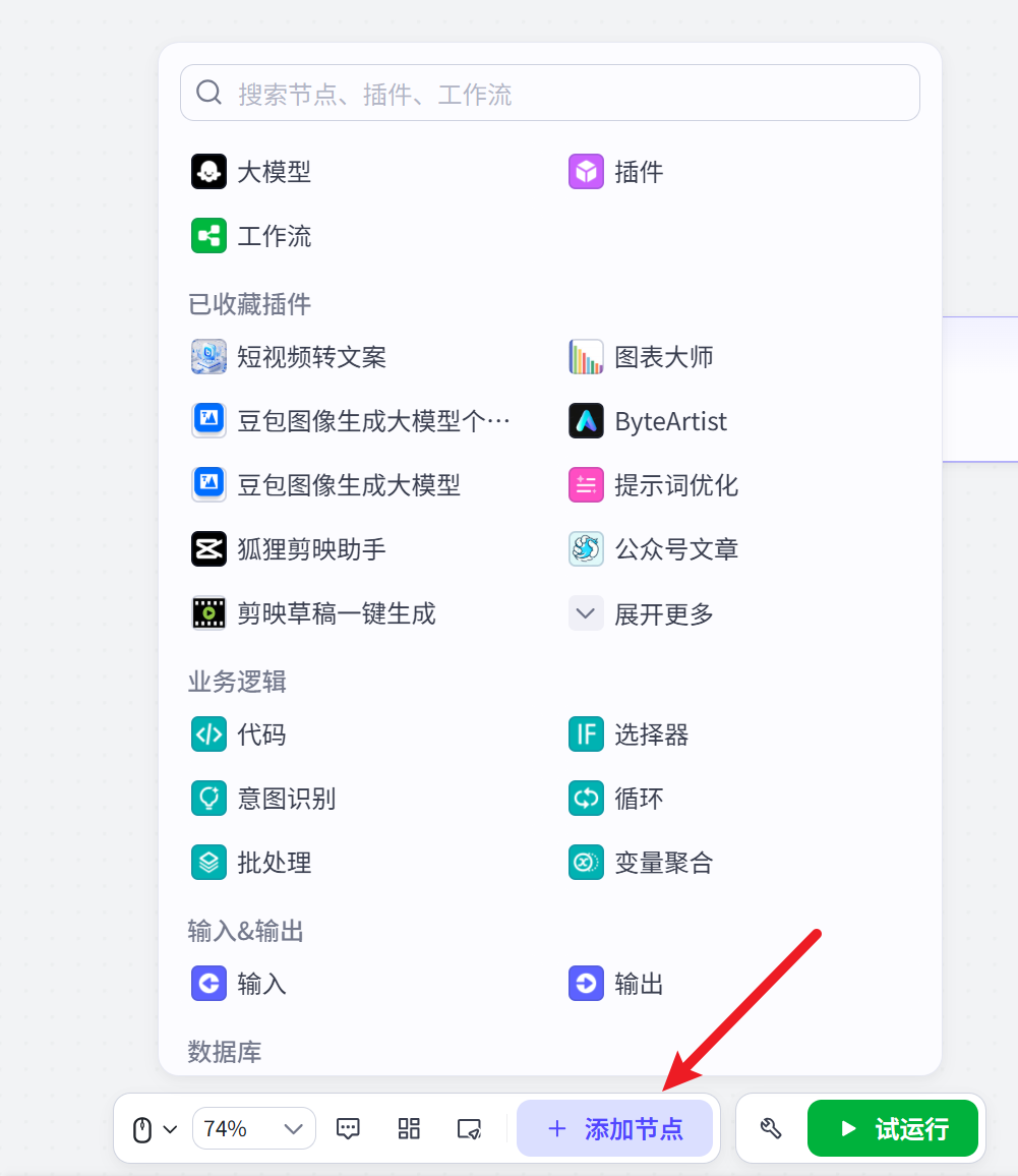 在这里,我们只需要找到两个节点:“头条搜索”插件和“大模型”节点