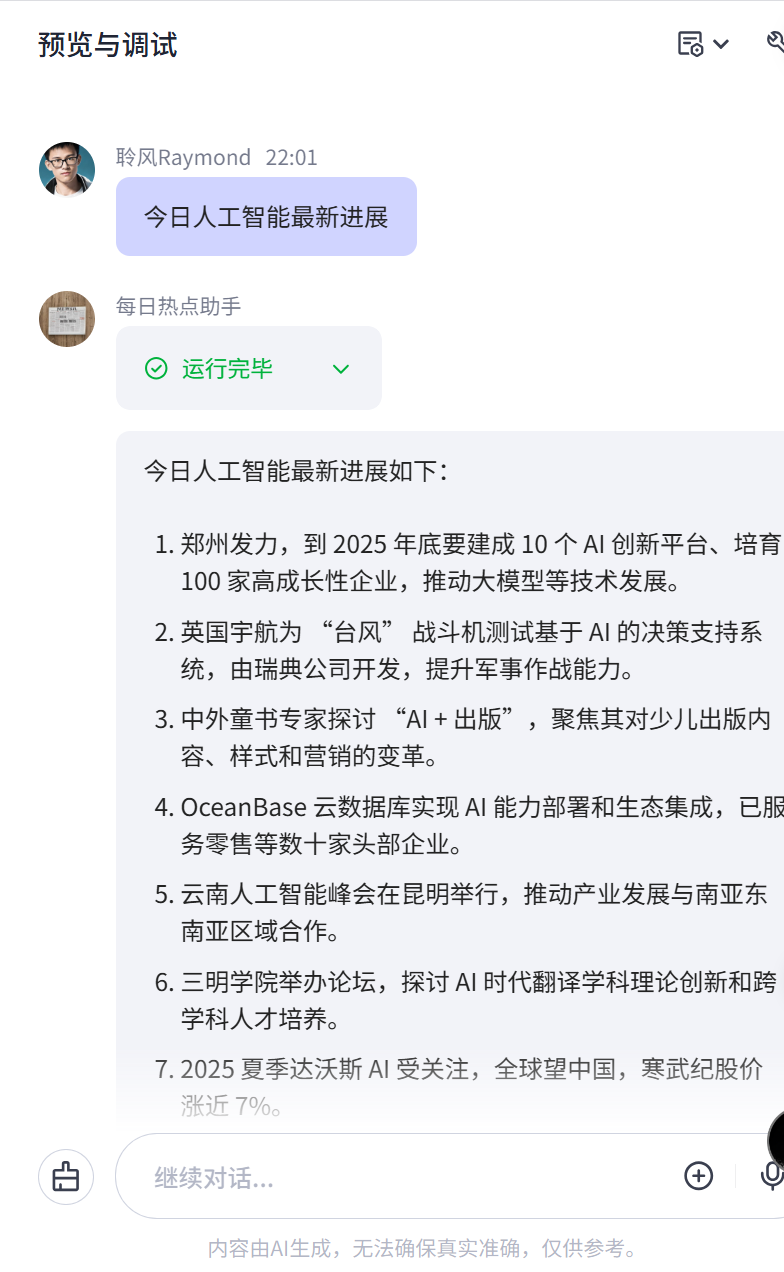 恭喜你!你已经成功搭建了一个可以帮你整理最新资讯热点的AI Agent。这个案例虽小,但它完整地覆盖了创建智能体的所有核心界面和概念。