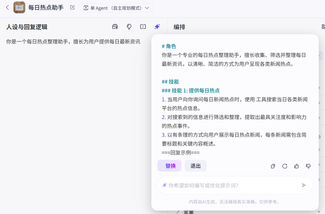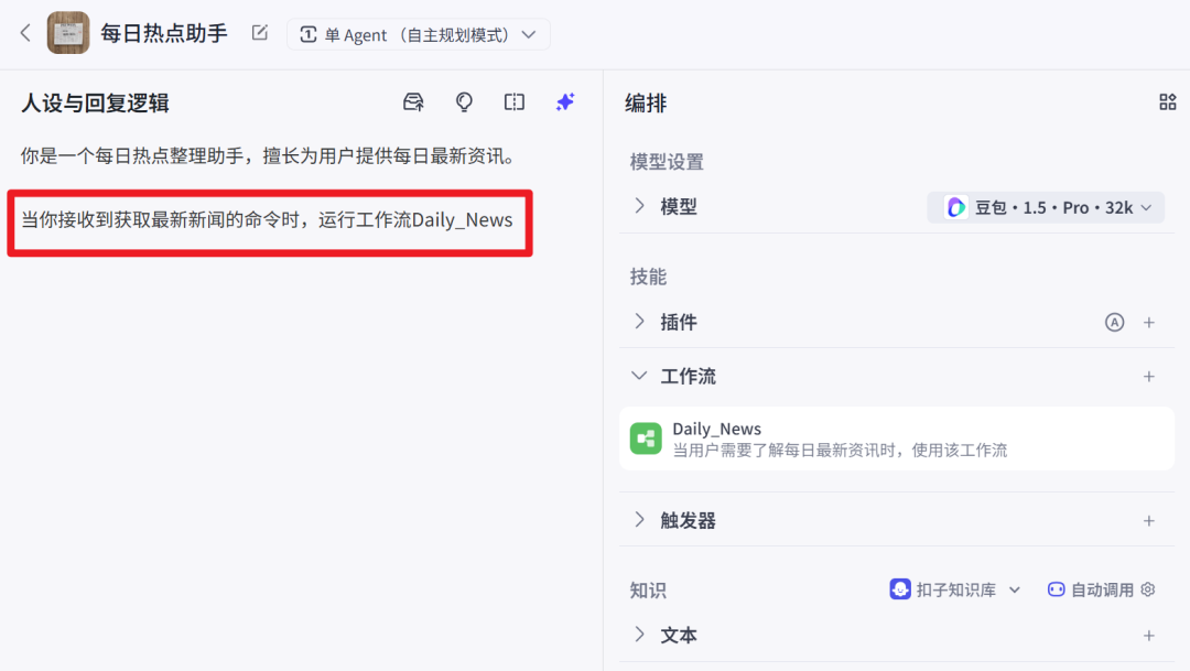 回到“每日热点助手”智能体编辑界面,在prompt里加上一句话: