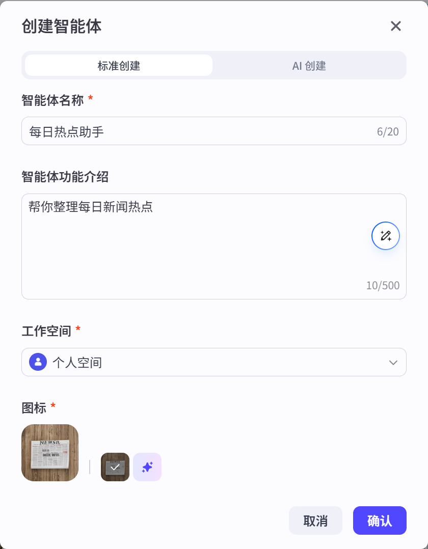 点击创建后,会弹出一个窗口,要求你填写智能体的基本信息: