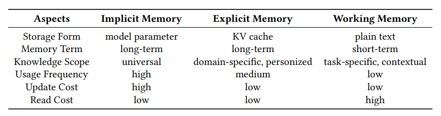• 显式记忆:压缩的、结构化的长期知识表示,例如对整本书或用户行为模式的理解,比隐式记忆更灵活且易于更新。