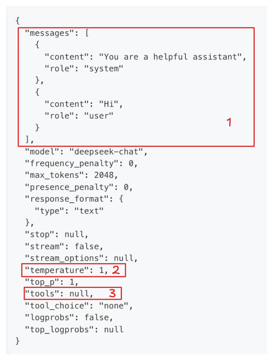 我们前面提到过大语言模型的 本质就是文字接龙 , 相对应的使用大模型也比较简单. 可以参见deepseek的文字接龙 api 请求: