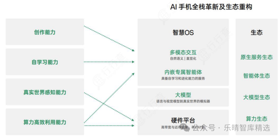 现有产业生态为“自有应用+第三方APP生态在上层,OS和SoC芯片为底层”的结构,未来将形成“混合算力为基座、大模型生态置于其上、智能体和AI原生服务生态构筑应用”的新型生态结构,产业生态变化较大。