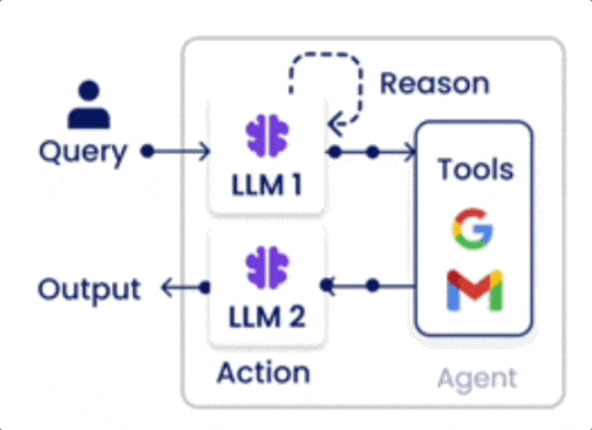 - 推理:LLM(大模型)分析当前状况和任务,决定“我接下来该做什么?用哪个工具?”