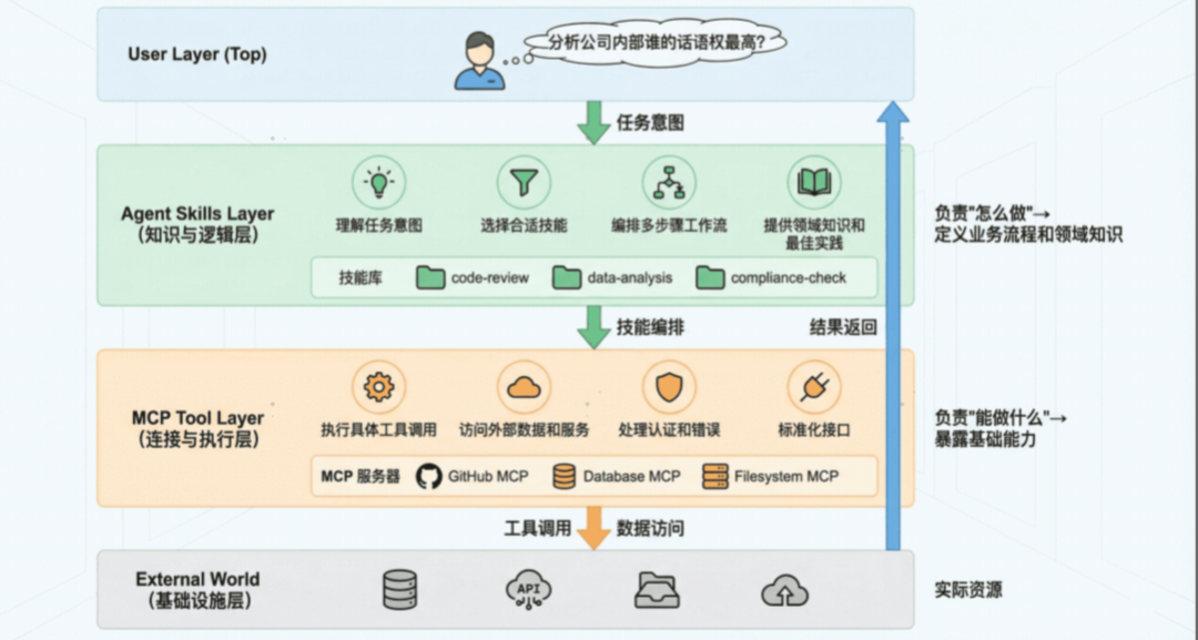 - Agent Skills:专注于任务的知识与工具打包,是标准化的技能单元;