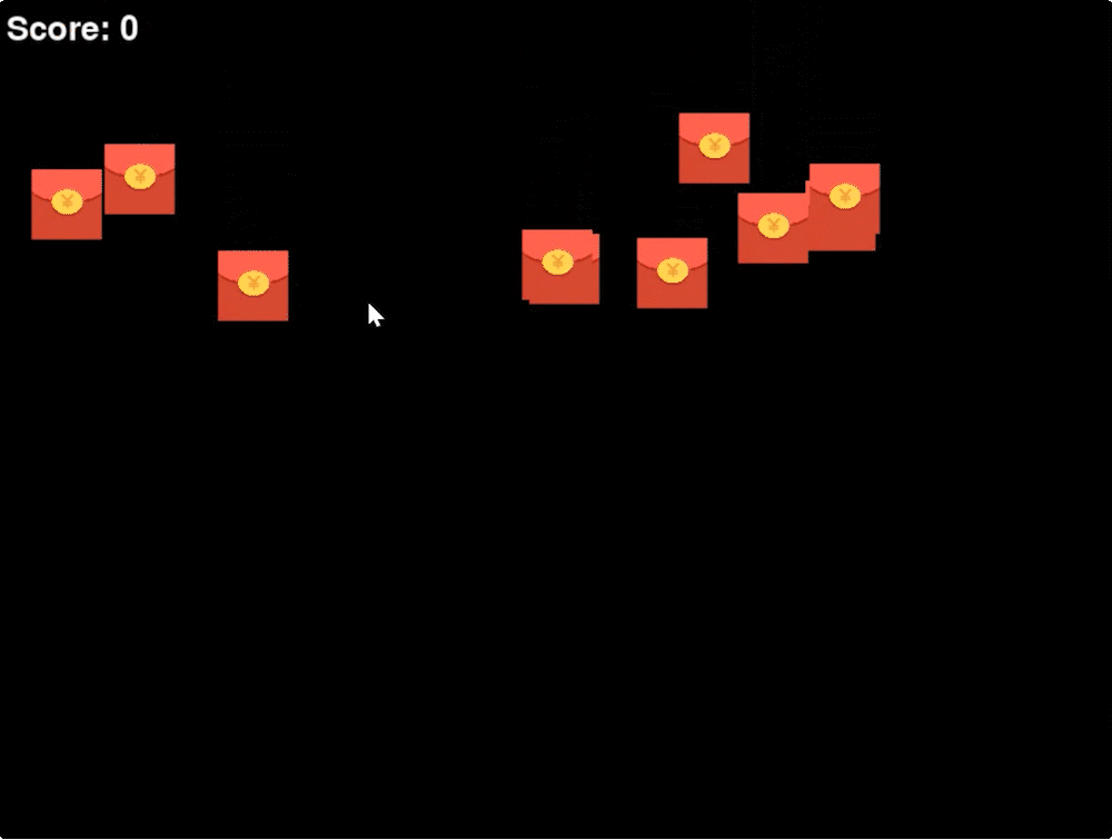 “红包雨”是一个点击小游戏,红包的外观是红色高瘦的圆角矩形,红包缓慢地从上方掉落,每个红包间距相等 ,没有重叠,鼠标点击任意一个红包,红包便随着互动点击而消失,同时显示一个吉利的数字,表示抢到这个红包得到了多少钱。