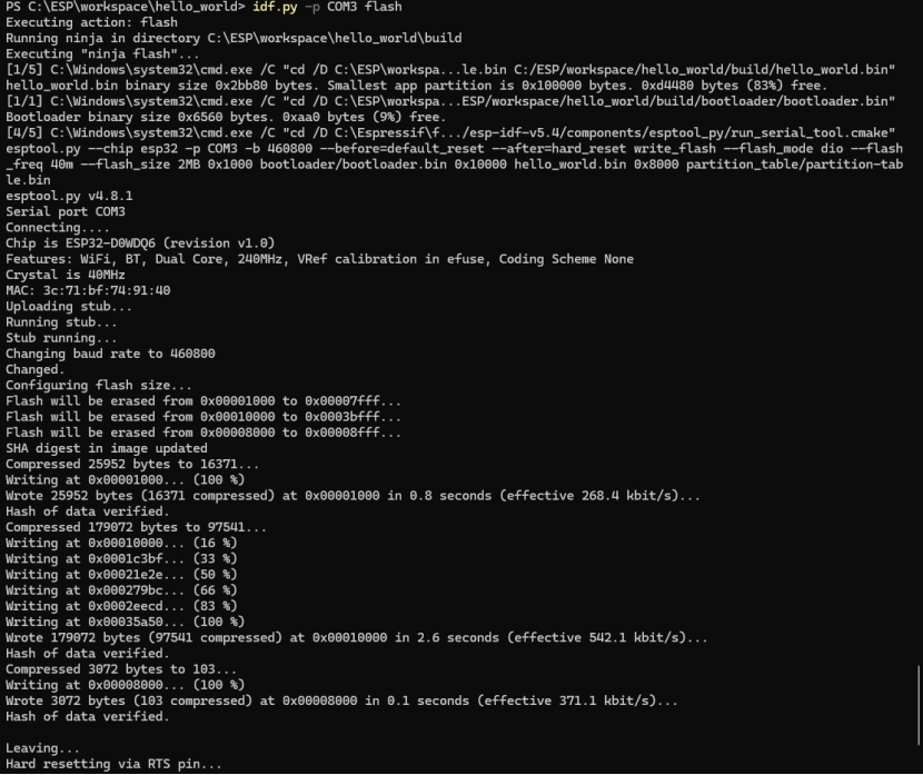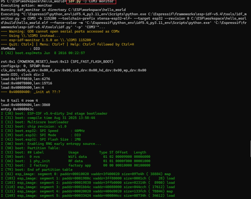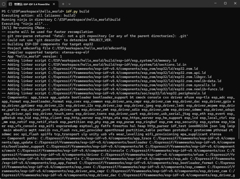 运行以上命令可以编译应用程序和所有 ESP-IDF 组件,接着生成引导加载程序、分区表和应用程序二进制文件。