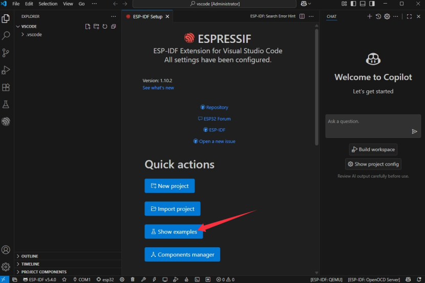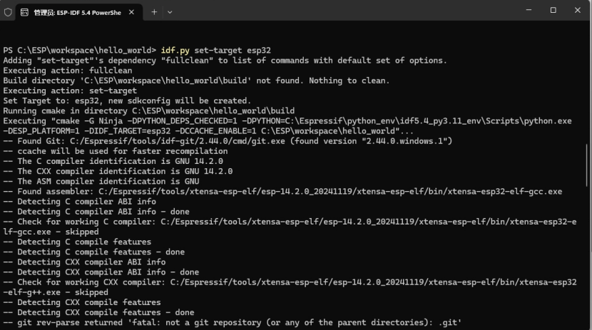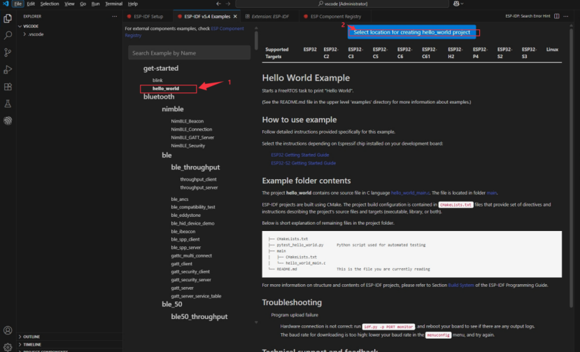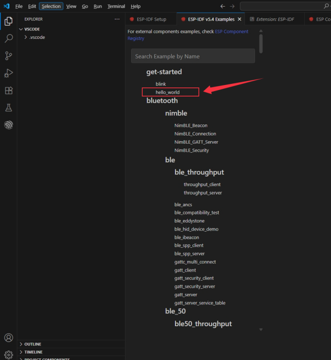 将SDK中的 C:\ESP\esp-idf-v5.4\examples\get-started/hello_world 工程复制至本地的c:\ESP\workspace目录下: