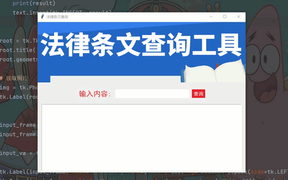 该文章演示了如何使用Python的tkinter库创建一个简单的GUI界面,该界面用于查询法律条文,特别是《中华人民共和国刑法》。用户输入内容后,程序从docx文档中提取相关条文并显示在文本框中。代码中还包括将数字转换为中文数字的功能,以适应法律条文的表达习惯。