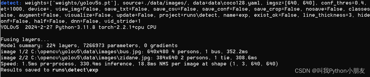 python detect.py --source ./data/images/ --weights weights/yolov5s.pt --conf-thres 0.4