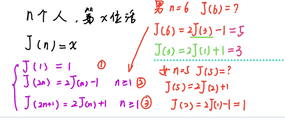当 n 不是 2 的幂次时,巧妙的部分来了:考虑比 n 小的最大的 2 的 m 幂次,然后在第一个大循环中,留一张、丢一张,直到剩下 2 的 m 幂次张牌,此时我们就回到了问题的特殊情况:目前留下的第 1 张牌会留到最后。