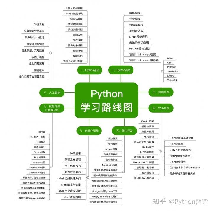 这是Python的整个知识体系图谱,对于新手来说,没必要学那么多。先把Python基础和进阶知识吃透,才是入门的关键。后续你是往前端开发深造,还是去新潮时髦的大数据、人工智能,就全凭自己的兴趣。但我相信这时候的你,应该不会像现在这么迷茫。
