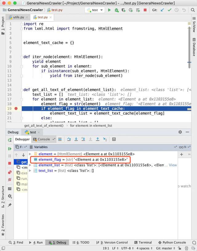 在示例代码里面,大家注意element_flag = str(element)这一行,它的值类似于<Element a at 0x1087ba638>,这里的十六进制数字0x1087ba638对应了这个对象在内存里面的地址。
