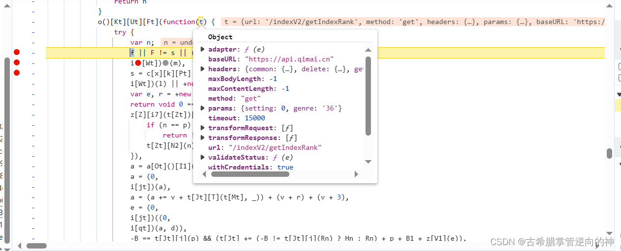 我们可以看到这个xhr断点段住了,那么我们就f11向上去跟栈,去找加密位置