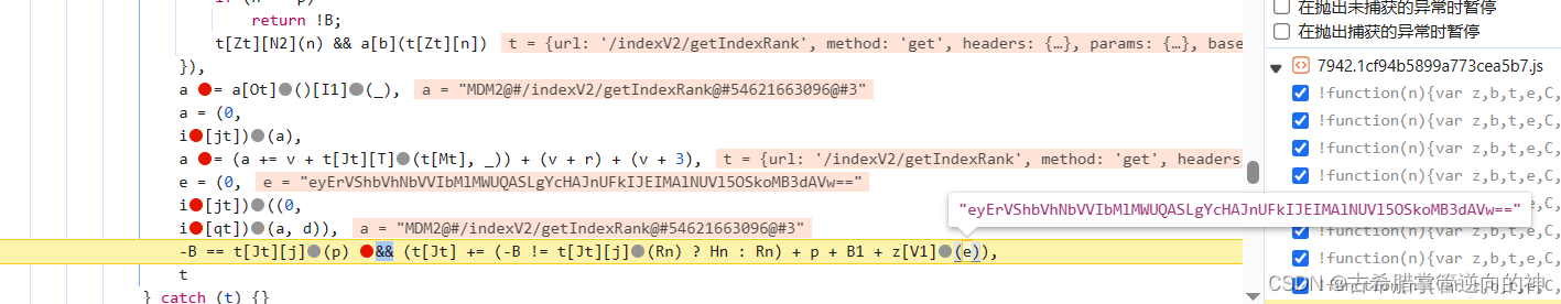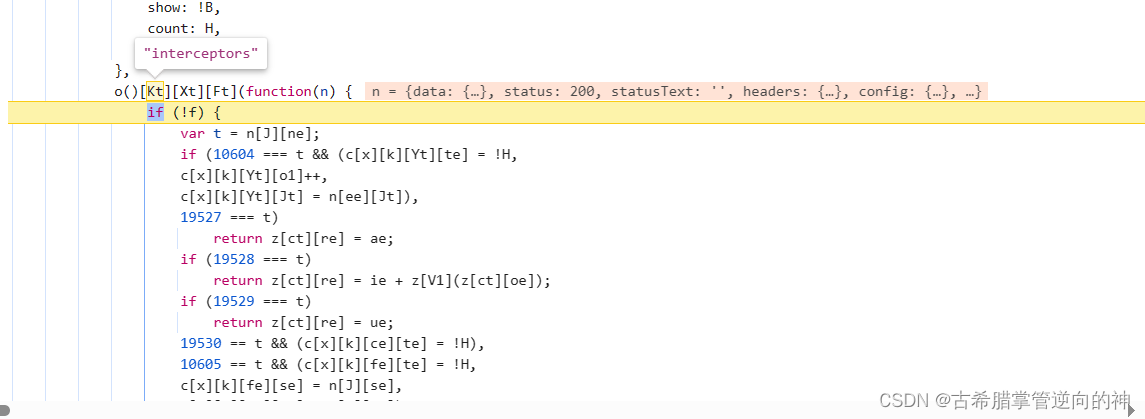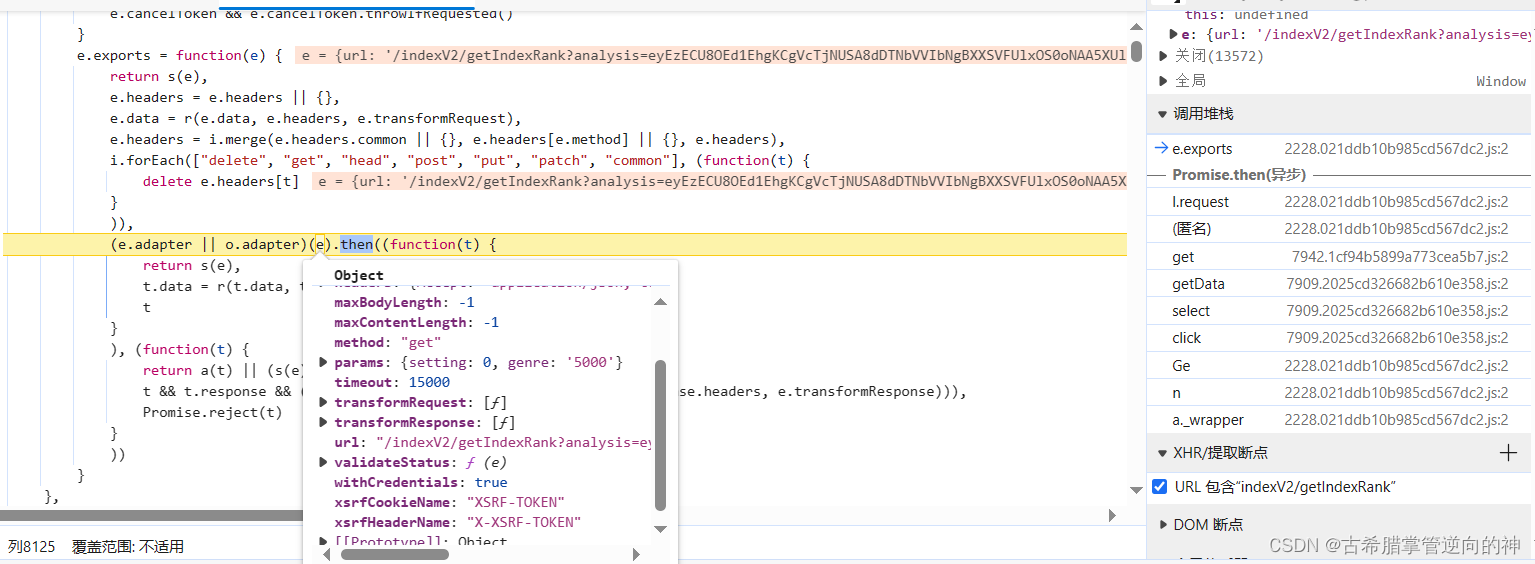 跳出之后我们就来到了这里,这里可以发现我们进入到了响应拦截器里面,但是我们的参数是请求用的,所以我们向上找请求拦截器,刚好他上面的位置就是请求拦截器,我们就可以在拦截器里下断点再重新断一下