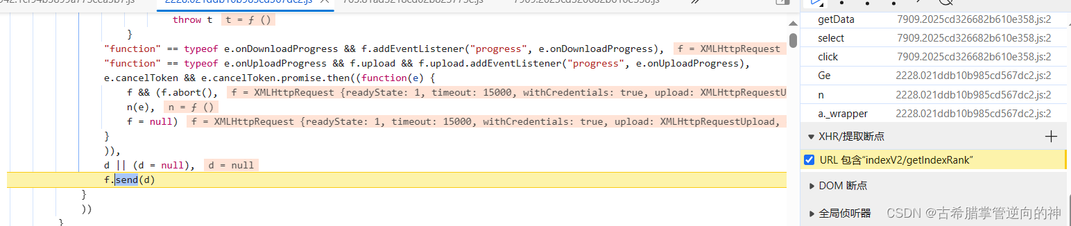 我们发现好像这个参数找不到,可能是混淆了,或者做了一些其他的处理我们不知道,那我们可以下一个xhr断点