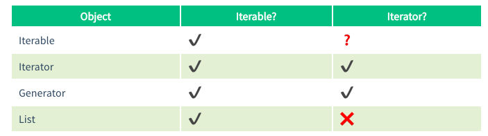 正如上表中所示,可迭代对象并不总是迭代器,但迭代器总是可迭代对象: