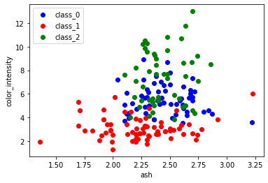 创建特征ash和color_intensity葡萄酒数据集的散点图。