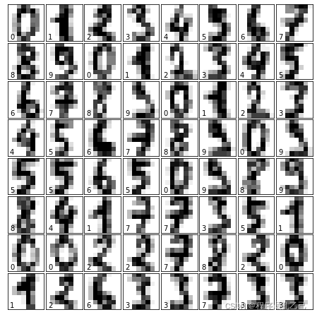 对于 范围( 64 ) 中的i , 每个图像是 8x8 像素:ax = fig 。add_subplot ( 8 , 8 , i + 1 , xticks = [], yticks = []) ax 。imshow (数字.图像[ i ], cmap = plt . cm . binary ,插值= 'nearest' )