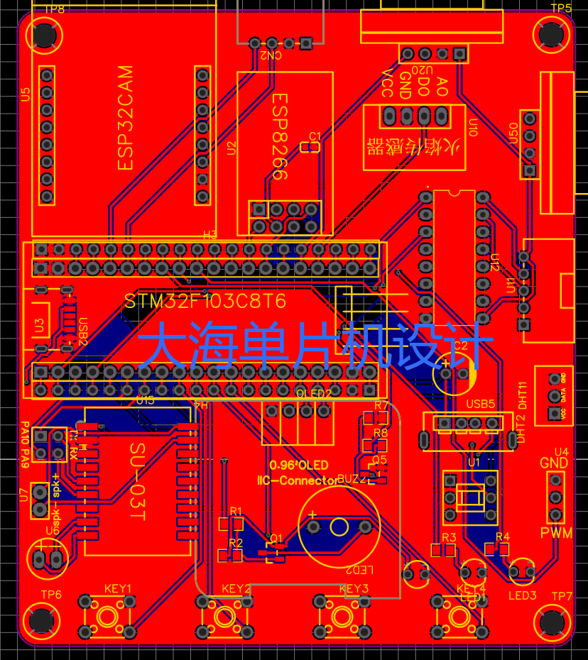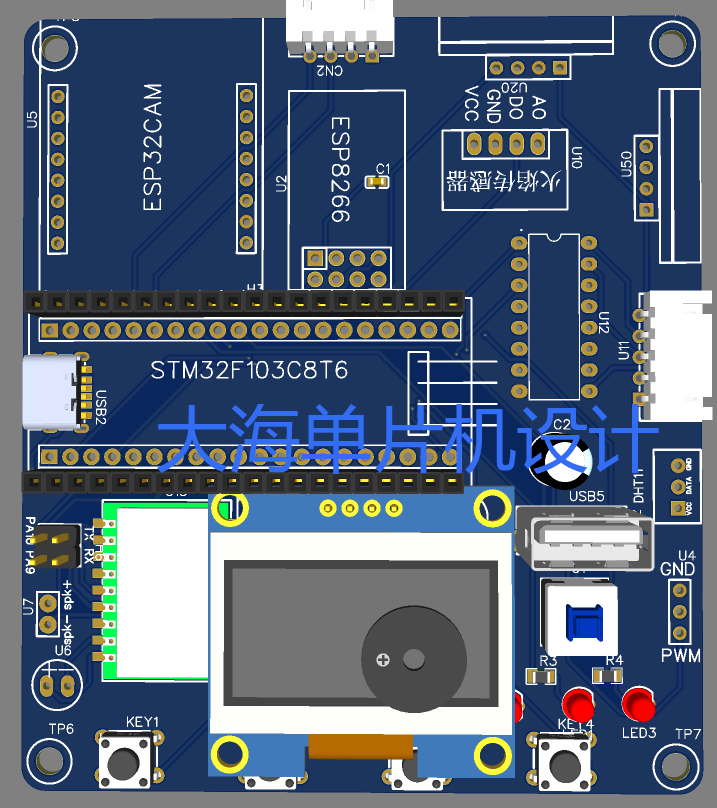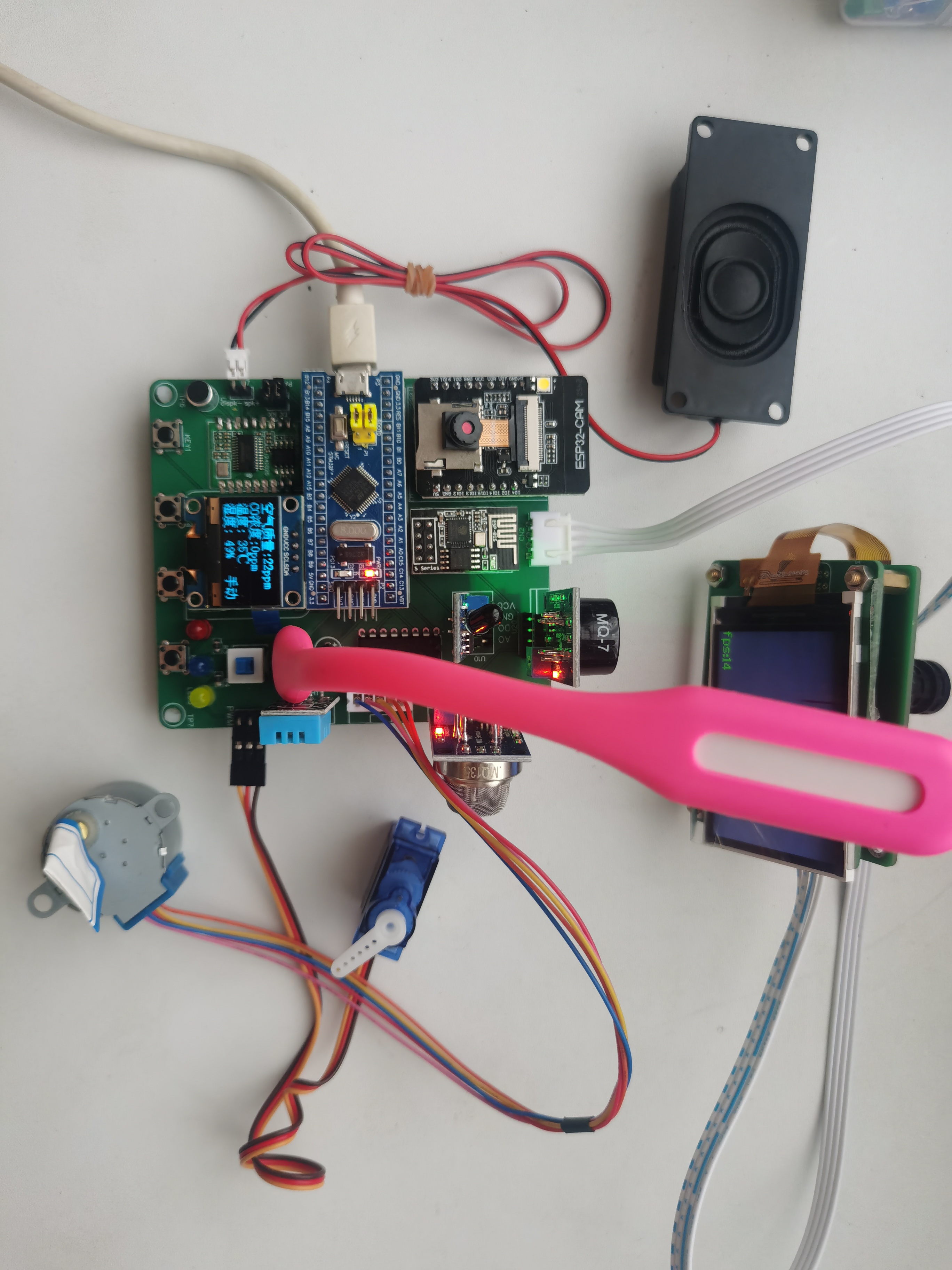 3、环境异常:当任何传感器值超过阈值(如检测到火焰、CO浓度过高),STM32会:点亮红色LED,启动蜂鸣器报警。
