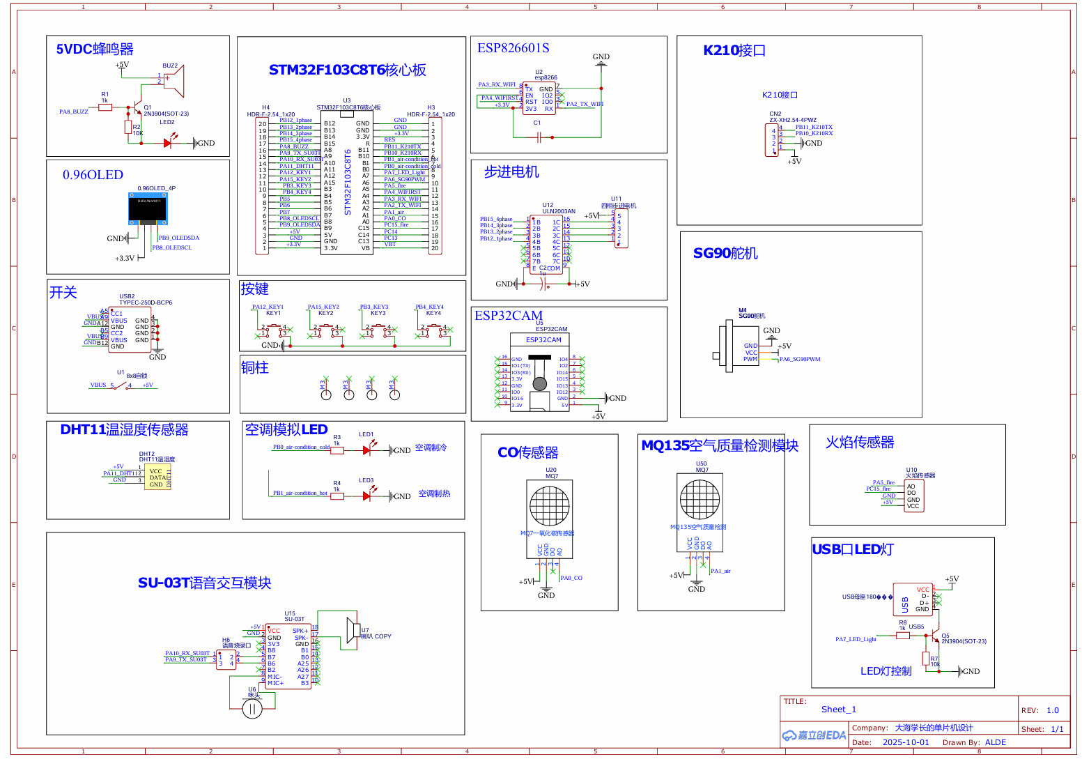 模块: 826601s + 步进电机(28) + LED(蓝色) + LED(黄色) + SG90舵机+K210+温湿度DHT11+MQ135+火焰传感器+蜂鸣器LED(红色)+MQ4 + ESP32CAM + OLED(0.96) 显示数据 + 按键界面切换 * 4 + 语音控制SU30T