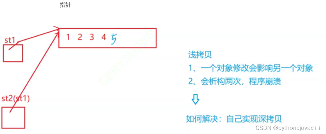 - 3. 若未显式定义,编译器会生成默认的拷贝构造函数。 默认的拷贝构造函数对象按内存存储按字节序完成拷贝,这种拷贝叫做浅拷贝,或者值拷贝
