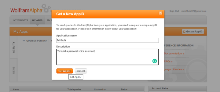 要访问 wolfram alpha API,需要一个唯一的 App ID,可以通过以下方式生成: