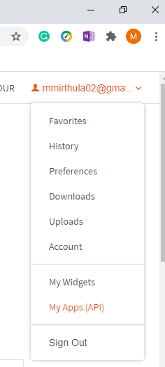 3. 现在您将看到该网站的主页。前往右上角的帐户部分,您可以在其中看到您的电子邮件。在下拉菜单中,选择我的应用程序 (API) 选项。