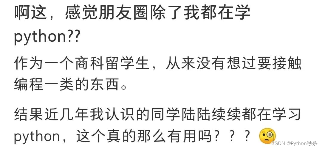 这个问题其实很好解答,如果毕业后不打算从事数据分析类的工作,就不必学习Python,避免浪费时间,但如果你的工作涉及到数据分析(例如:产品、运营、市场、量化投资等)那么学好了Python不仅会加强竞争力,还能助你早日实现财富自由💰