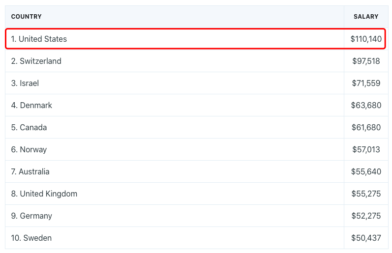 其中,人均薪资最高的,毫不意外是美国地区。但是看到这个薪资水平,还是让职问君狠狠地酸了一把,毕竟可是人均年薪114,904美元。