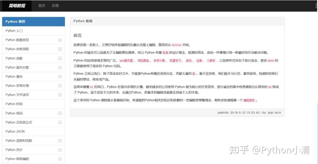 这是一个英文网站,不管是小白还是有经验的程序员,都可以来这个网站学习,他涵盖基本和高级的python概念,而且所有的教程都做了有序的分组,很方便。
