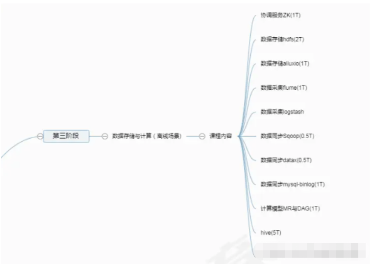 为数据存储与计算(离线场景),主要讲解协调服务ZK(1T)、数据存储hdfs(2T)、数据存储alluxio(1T)、数据采集flume、数据采集logstash、数据同步Sqoop(0.5T)、数据同步datax(0.5T)、数据同步mysql-binlog(1T)、计算模型MR与DAG(1T)、hive(5T)、Impala(1T)、任务调度Azkaban、任务调度airflow等。