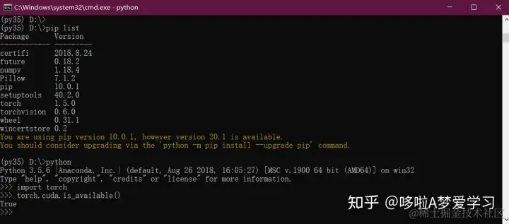 先使用命令pip list查看已安装的包列表,再输入命令python,然后 torch.cuda.is_available(),输出True,即安装成功