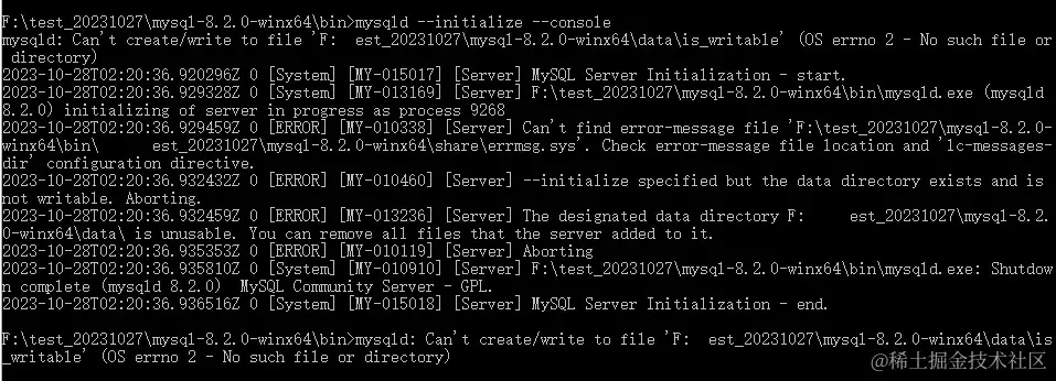遇到第一个坑,mysqld: Can’t create/write to file ‘F: est_20231027\mysql-8.2.0-winx64\data\is_writable’ (OS errno 2 - No such file or directory)