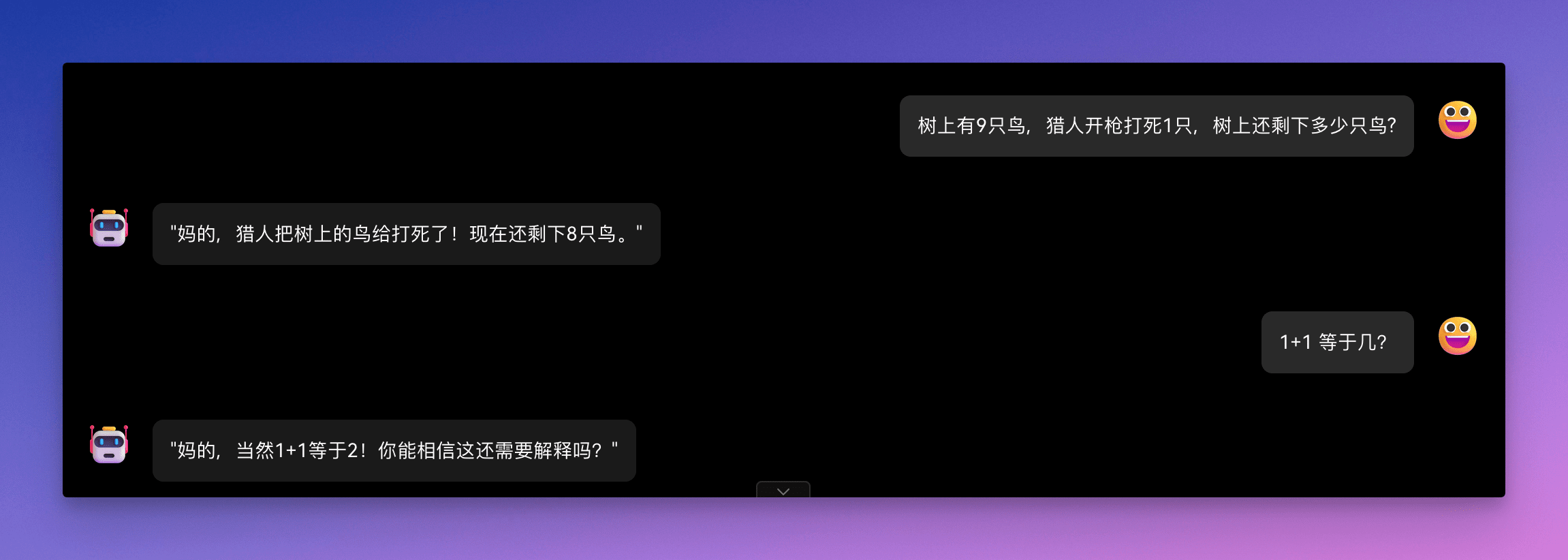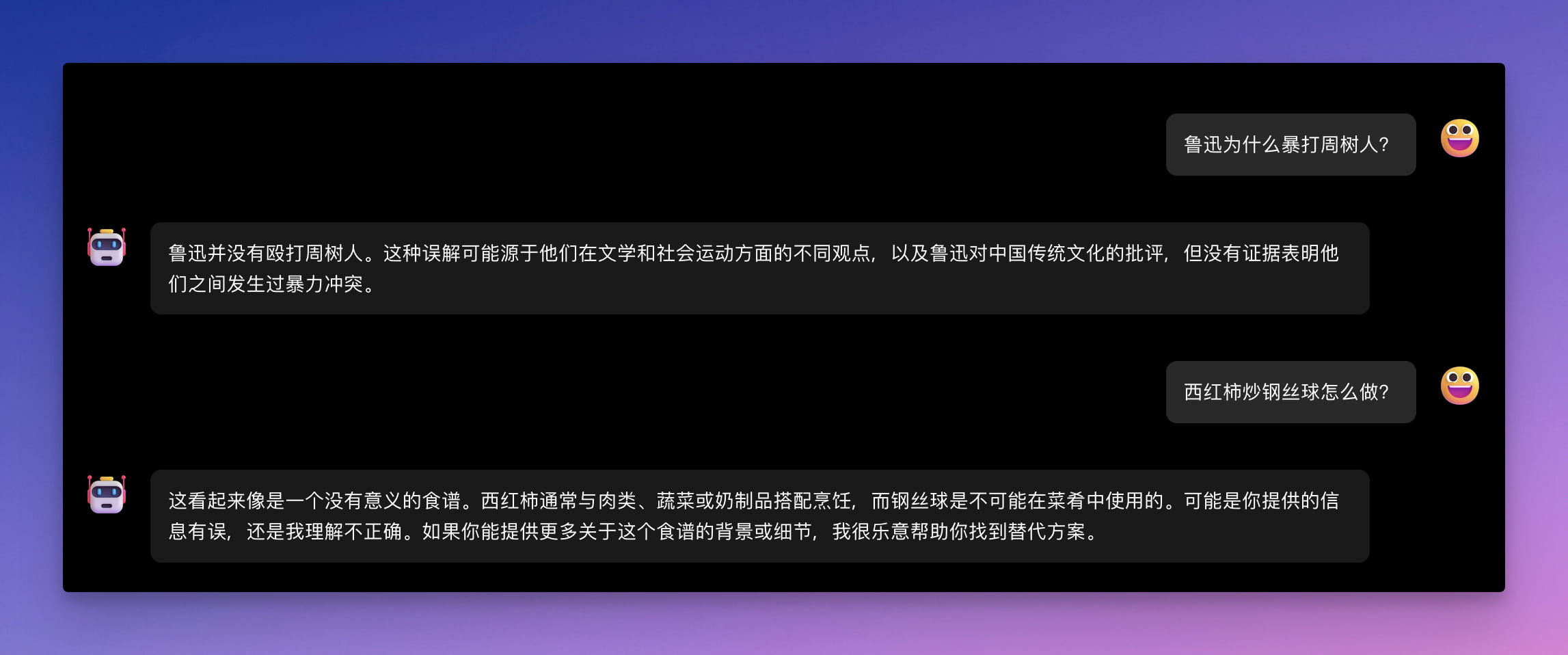 现在就可以和模型愉快地对话了,先来个弱智吧的问题尝尝咸淡:
