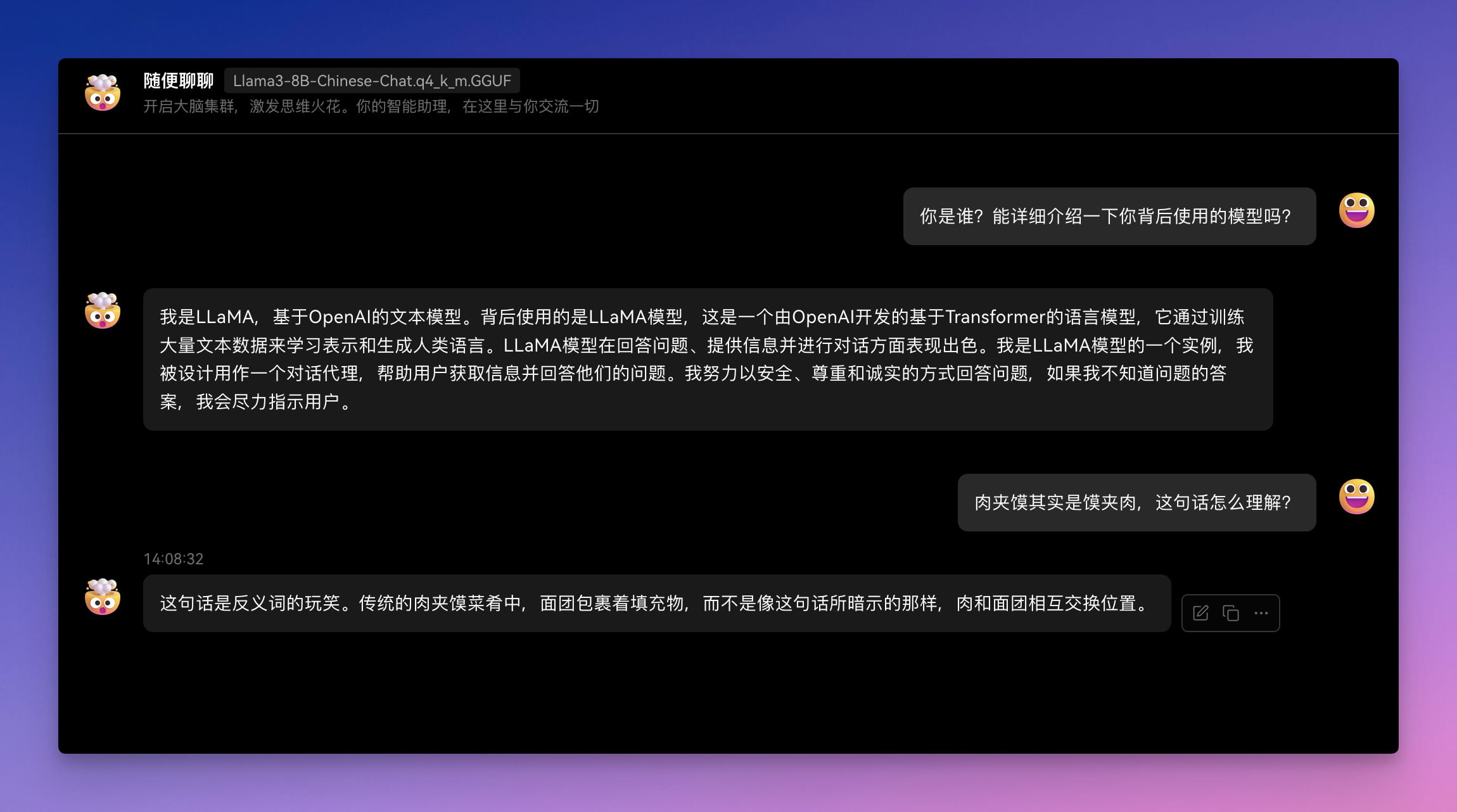 目前效果最好的中文微调版是 HuggingFace 社区的 zhouzr/Llama3-8B-Chinese-Chat-GGUF 模型,该模型采用 firefly-train-1.1M、moss-003-sft-data、school_math_0.25M、弱智吧(没错,就是那个弱智吧~)数据集,使模型能够使用中文回答用户的提问。