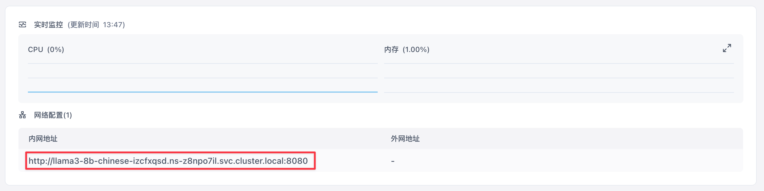 等待实例状态变成 running 之后,Llama3 中文版模型就部署好了,默认会提供一个与 OpenAI 官方接口对齐的 API,你可以打开终端直接通过 API 来测试。我框出来的部分就是该模型 API 在 Sealos 集群的内网地址,你可以点击它直接复制。