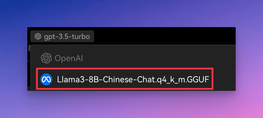 在弹出来的下拉框中点击「Llama3-8B-Chinese-Chat.q4_k_m.GGUF」,切换到该模型。