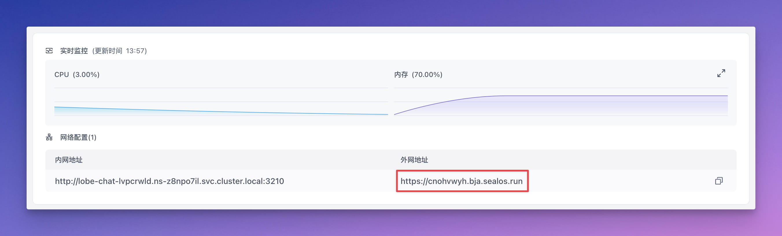 然后点击右上角的「部署应用」,部署完成后,直接点击应用的「详情」进入该应用的详情页面,等待实例状态变成 running 之后,点击外网地址即可打开 Lobe Chat 的可视化界面。