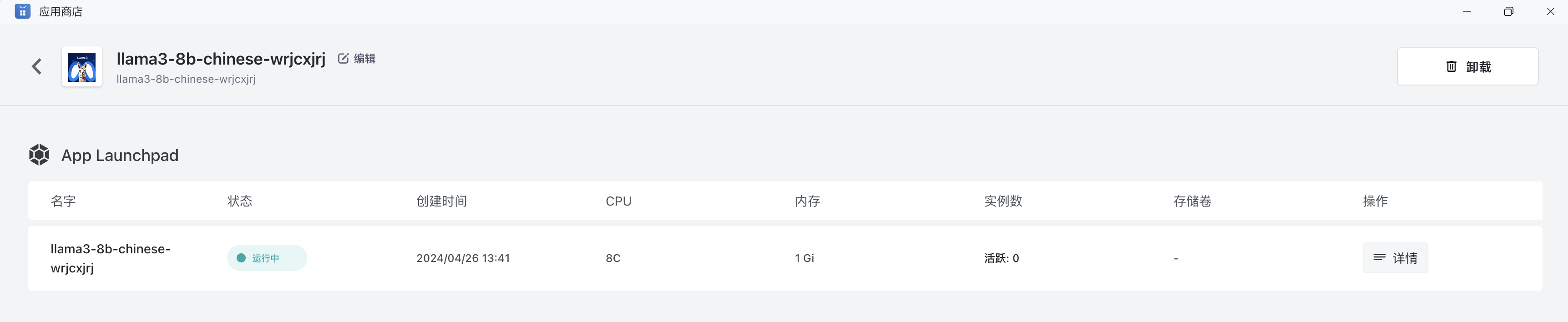 跳转进来之后,点击右上角的「部署应用」开始部署,部署完成后,直接点击应用的「详情」进入该应用的详情页面。