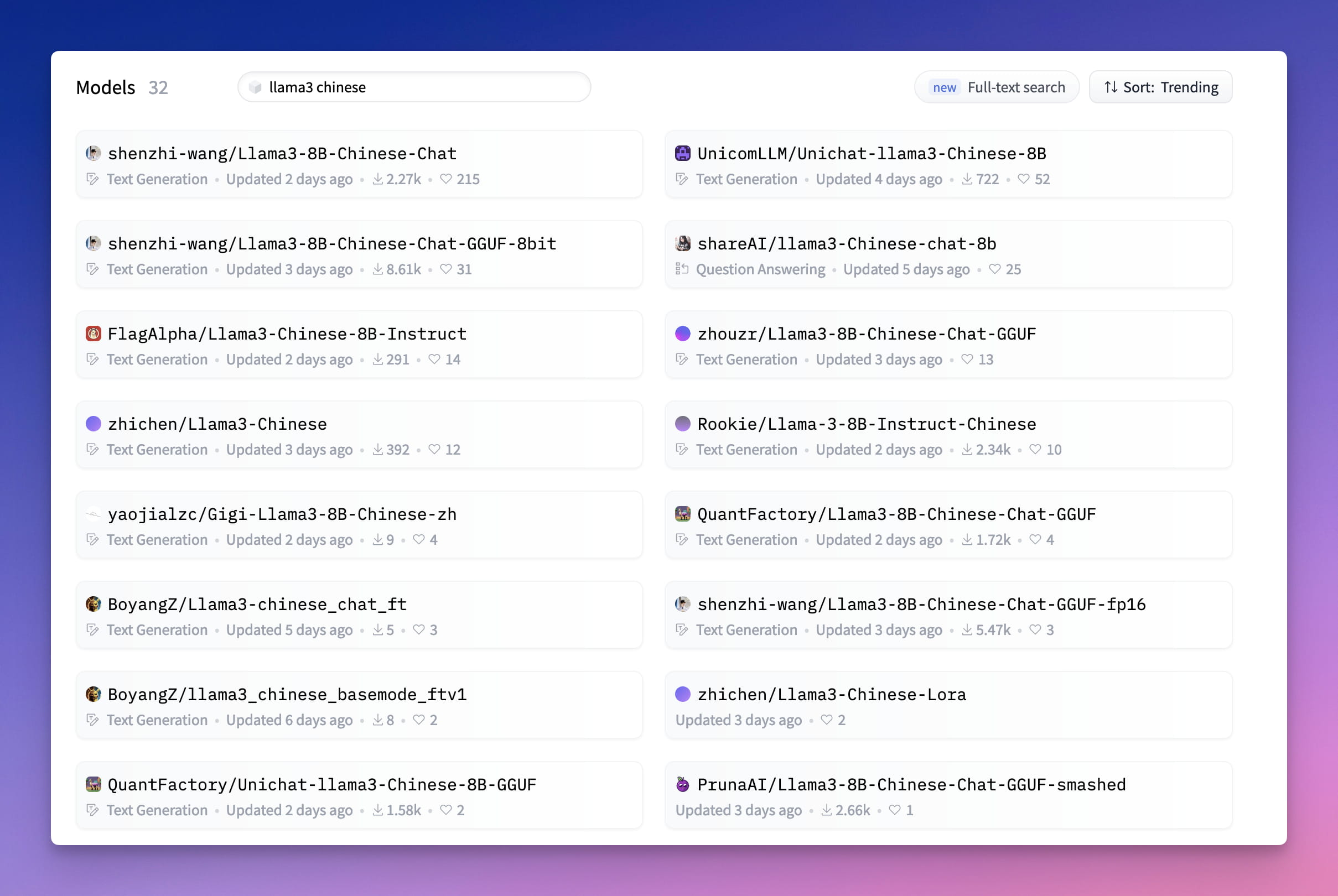 虽然才过去短短几日,Huggingface 上已经涌现了非常多的 Llama3 中文微调版,令人眼花缭乱: