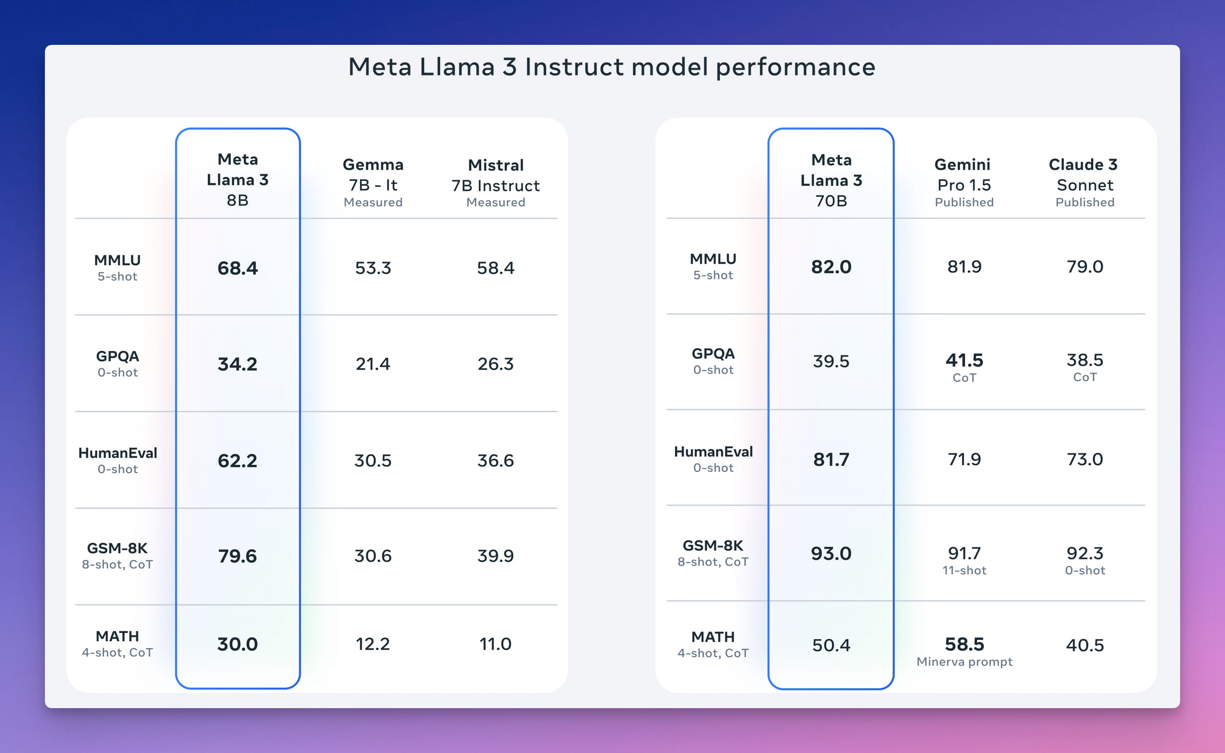 美国当地时间4月18日,Meta 在官网上发布了两款开源大模型,参数分别达到 80 亿 (8B) 和 700 亿 (70B),是目前同体量下性能最好的开源模型,而且直接逼近了一线顶级商业模型 GPT-4 和 Claude3。