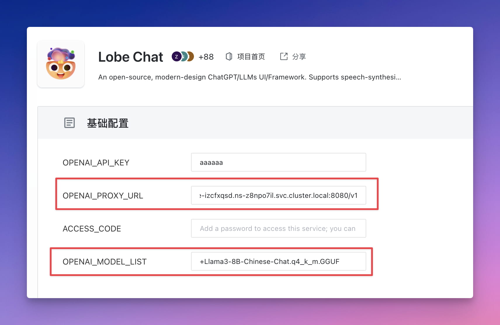 OPENAI_PROXY_URL的值就是我们刚刚复制的内网 API 接口地址,记得要在末尾加上/v1。OPENAI_MODEL_LIST的值是+Llama3-8B-Chinese-Chat.q4_k_m.GGUF。OPENAI_API_KEY的值随便瞎写一个就行。
