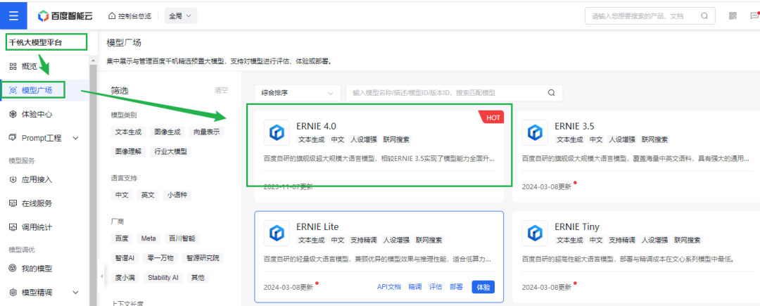 里面由很多大模型,这里推荐 ERNIE 4.0,内部支持RAG