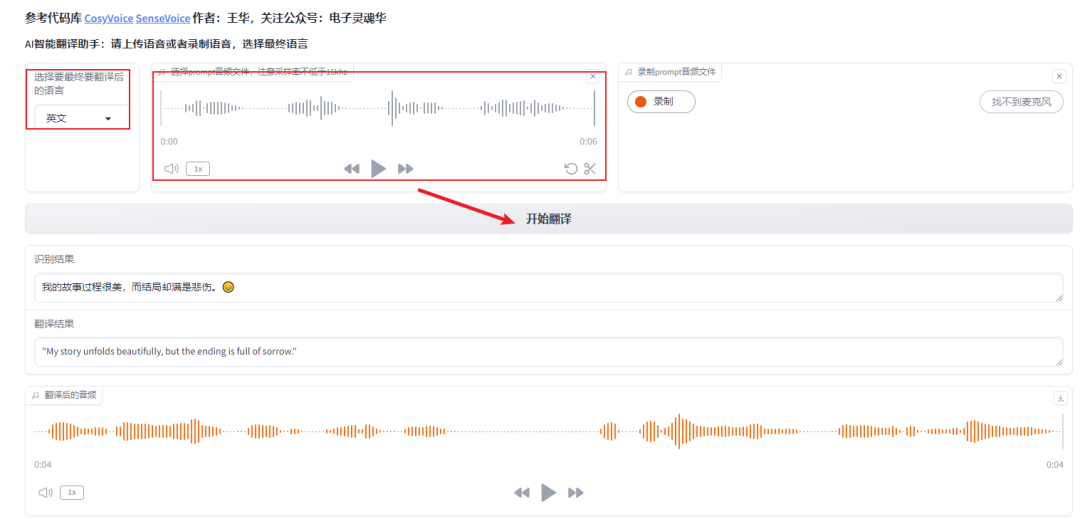 首先将输入的语音通过Sensevoice转成文字,输入给大模型,转出目标语言文字,最后通过CosyVoice的多语言复刻模型转成目标语言语音,最后完成语音到语音的翻译