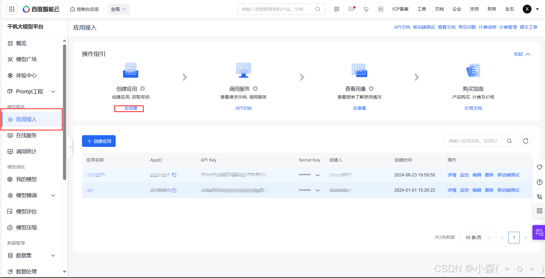 我们可以去百度千帆大模型平台,创建模型,调用API Key 和 Secret Key: