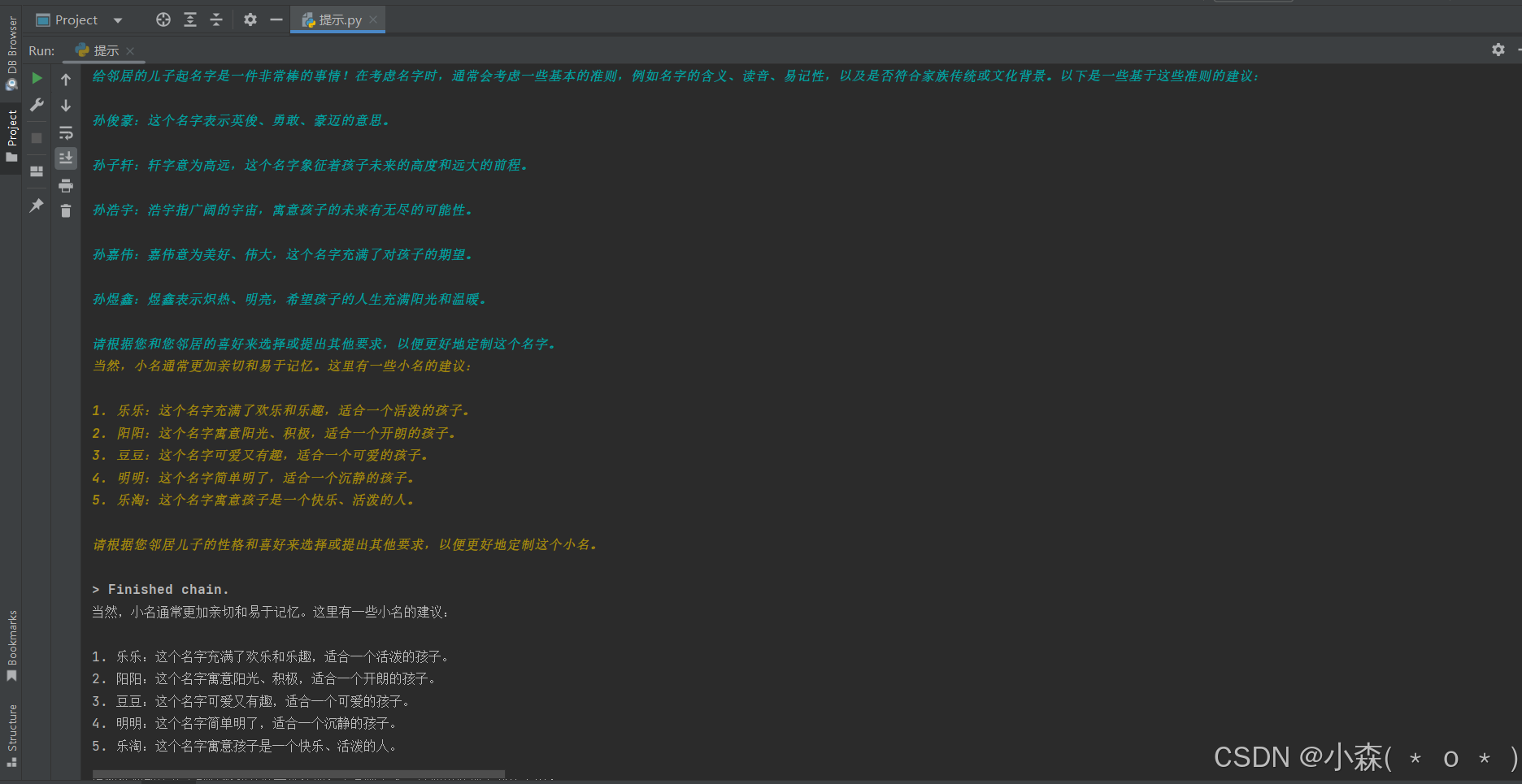 我们可以通过打印出来的提示词观察到,prefix参数就是前缀的提示词,examples是给出的实例,example_prompt定义了如何将每个示例格式化为字符串(规定了实例怎么被输出出来)。